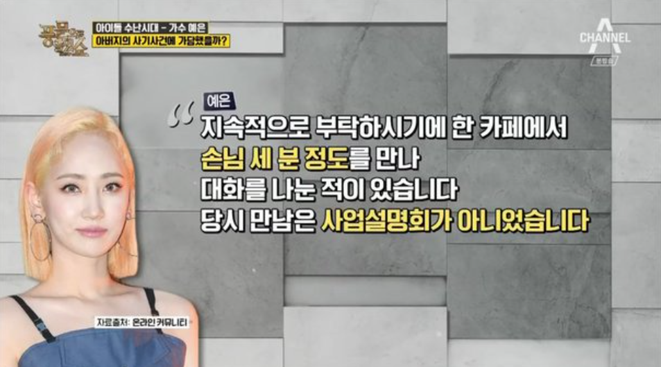 이 같은 사건들로 예은은 세간에 오르내리며 힘든 시간을 보내야만 했는데요. 그녀는 “어린 시절 부모님의 이혼과 아버지의 재혼으로 아버지와 인연을 끊고 살았다”라며 “2012년 언니의 결혼으로 연락하게 된 아버지는 이후 자신에게 계속 연락해왔다고 했다”라고 설명했습니다.