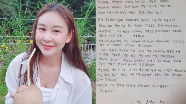 윤태화는 자필 펼지로 결혼 소식을 전하며 “행복하게 살려면 가수로서 더 이룬 것이 있어야 한다고 생각해 결혼은 먼 이야기라고 생각하며 살았다”라며 “하지만 저를 응원해주는 사람들을 보며 활동할 힘을 얻고 또 행복하게 살다 보면 이루는 것도 많아지고 인생의 길을 함께 할 소중한 사람이 힘이 될 거라고 생각했다”고 전했는데요.