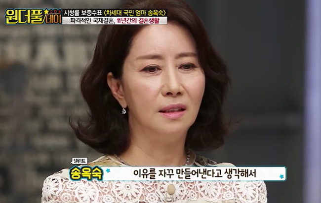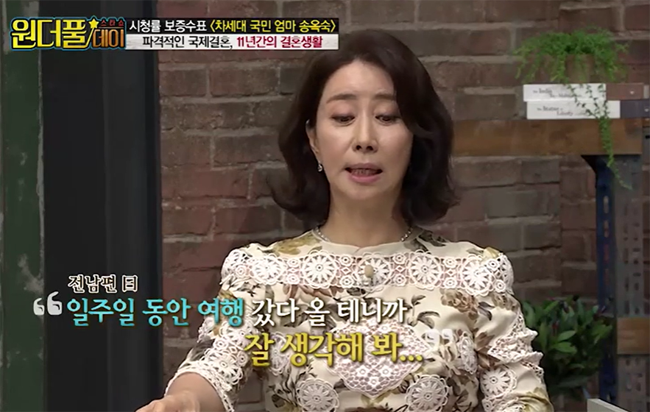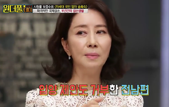 하지만 송옥숙은 힘든 결혼생활이어도 이혼할 생각은 없었다고 하는데요. 어느 날 전 남편이 이혼 서류를 가져와 이혼을 제안했다고 합니다.