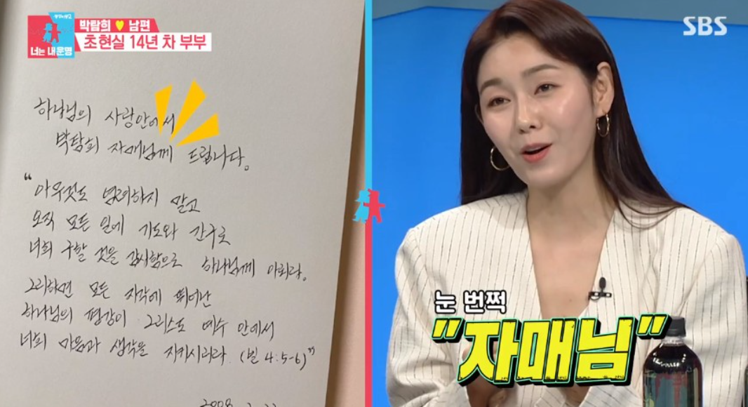 당시 박탐희는 외로움이 극에 달한 상태였다고 하는데요. “남편의 신앙 서적에 손 편지, ‘자매님’이라고 적혀있더라”라며 첫 만남 당시 서로 이야기도 잘 통하고 집까지 데려다주며 책에다 편지를 써서 박탐희에게 주었다고 합니다.