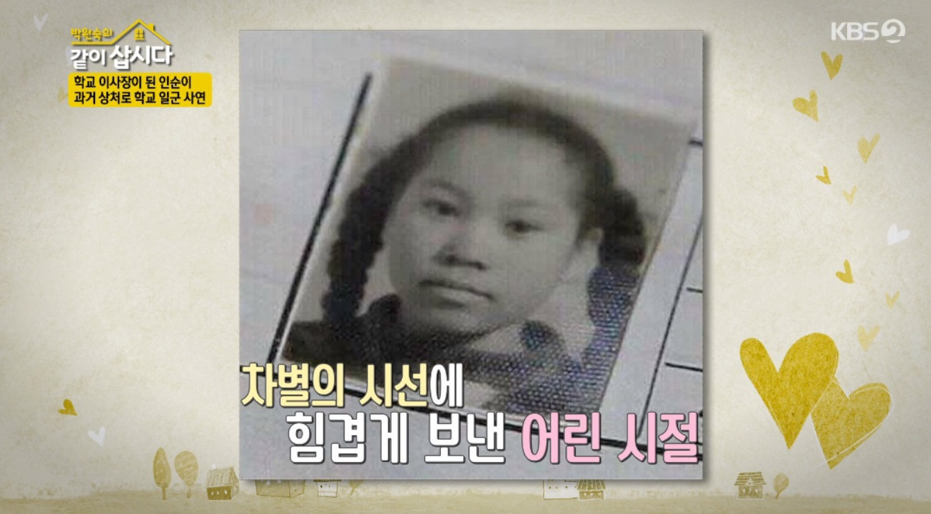 인순이는 어린 시절 아버지와 몇 번의 편지를 주고 받은 게 다라고 하는데요. 그녀는 "부모를 원망하진 않아요. 제가 열네 살 때 아버지로부터 미국으로 오라는 편지를 받았지만 어머니와 그 편지를 찢어버렸어요. 그쪽의 또 다른 가족에게 슬픔을 안겨주기가 싫었던 거지요."라고 털어놓았습니다.