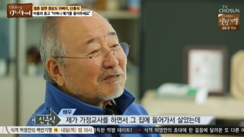 배우 신충식은 가정교사로 갔던 집에서 지금의 아내를 만나게 되었다고 하는데요. 그는 “내가 가정교사로 갔는데 그 집에 예쁜 처녀가 하나 있었다. 그게 우리 집사람이다. 내가 가르쳤던 학생이 처삼촌이다. 나이 어린 삼촌을 내가 가르친 거다”고 설명했습니다.