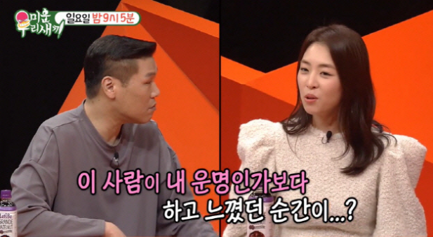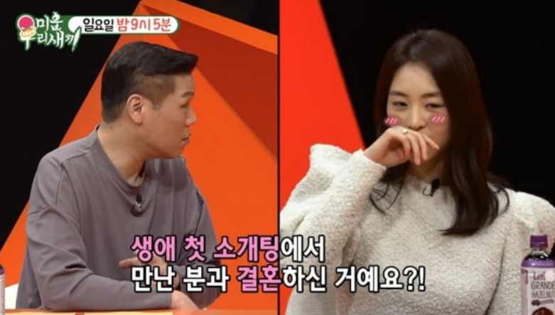 이어 SBS 예능 ‘미운 우리 새끼’에 출연하여 남편과의 만남과 결혼 스토리를 공개했는데요. "생애 첫 소개팅에서 만난 분과 결혼한 거냐"라는 서장훈의 질문엔 "그쵸"라고 답하며 "이 사람이 내 운명의 짝인가'라는 생각이 언제 들었냐"라는 질문에는 "그냥 처음 만났을 때부터"라고 답하였습니다.