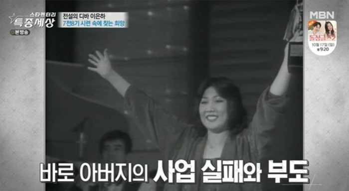 이은하는 "아버지가 그 이후로 내가 떠나가겠다고 생각하셨는지 건설한다고 사람들을 만났다. 어음, 당좌에 내 이름으로 사인했다“라며 알지도 못하는 상태에서 1992년도에 7억 정도 부도가 났다고 합니다.