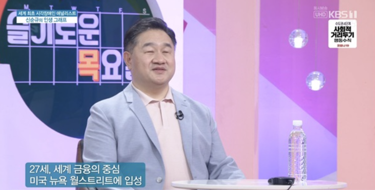 애널리스트 겸 작가 신순규(55) 씨는 세계 최초 시각장애인 공인재무분석사(CFA)로 하버드에서 심리학을 전공, 매사추세츠공대(MIT) 경영학, 조직학 박사 과정을 밟은 뒤 미국 월스트리트에서 28년째 일해 온 인물로 현재 세계적 투자은행 브라운브러더스해리먼(Brown Brothers Harriman)에서 근무 중입니다.