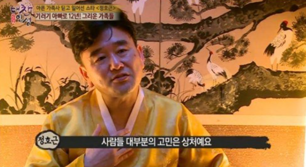 정호근은 아내 장윤선 씨와 만난 지 세 번 만에 프러포즈하여 1995년 결혼에 골인했다고 하는데요. 그러나 1996년 칠삭둥이로 태어난 큰 딸이 생후 27개월 만에 폐동맥 고혈압으로 세상을 떠나며 그 충격으로 정호근은 방황을 하게 됩니다.
