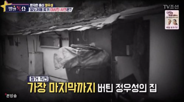 가난한 유년시절을 보낸 정우성은 재개발 지역의 판자촌 산동네에서 살았다고 하며 그중에서도 마지막까지 남았던 집이 정우성 집이었다고 합니다.