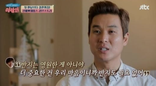 이에 "아내가 리더십이 있다"며 "제가 '난 돈도 없어서 반지도 못 사준다'고 하니 선예는 '반지 같은 건 영원한 게 아니다. 더 중요한 건 마음이다. 반지는 필요 없다'고 하더라"고 전했습니다.
