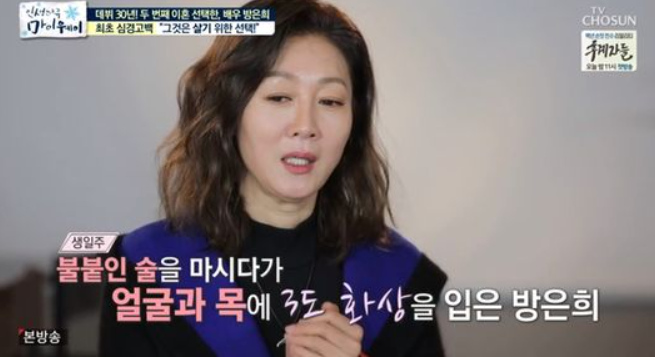 방은희는 두 번째 이혼에 대해 "일주일에 5일 이상은 술을 마시고 들어왔다. 집에 들어오면 휴대폰을 끄길래 우연히 봤더니 '오빠 어디야', '오빠 뭐해'라는 문자가 있었다"라며 '사업하다 보면 그럴 수 있지'라고 생각했다“라고 설명했는데요.