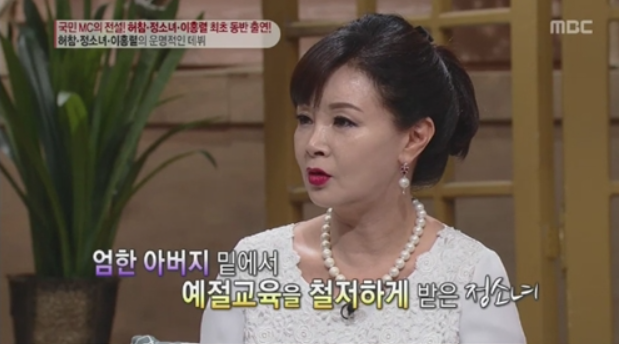 정소녀의 아버지는 헌병 대장 출신으로 굉장히 엄했다고 하는데요. 큰 딸이었던 정소녀는 특히 예절교육을 철저하게 받았고 회초리로도 많이 맞았다고 합니다.