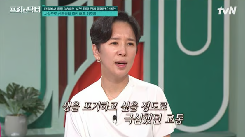 최준용의 아내 한아름은 가족성 선종성 용종증을 앓고 있다고 털어놨는데요. 그녀는 "33살에 처음 병원에 갔는데 가족성 선종성 용종증이라고 하더라. 대장 전체에 3800개 이상의 용종이 발견됐다. 언제 암으로 진행될지 몰라서 대장 전체를 절제했다"고 설명했습니다.