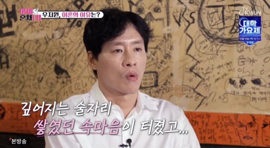 우지원은(51) TV조선 예능 프로그램 ‘이제 혼자다’에 출연하여 이혼 후 일상을 공개하며 전부인과의 이혼 사유에 대해서도 털어놓았는데요.