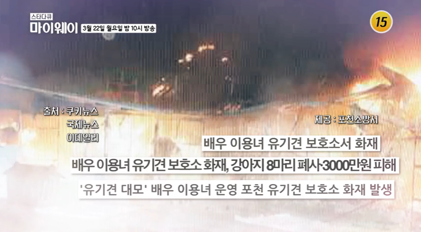 그런 그녀의 정성과 희생으로 유기견들과 함께 생활했던 공간이 이번 불로 인해 유기견 8마리가 폐사하고 2961재산 피해(소방서 추산)를 입었다고 하며 이용녀의 생활공간이 불에 타버렸다고 하는군요.