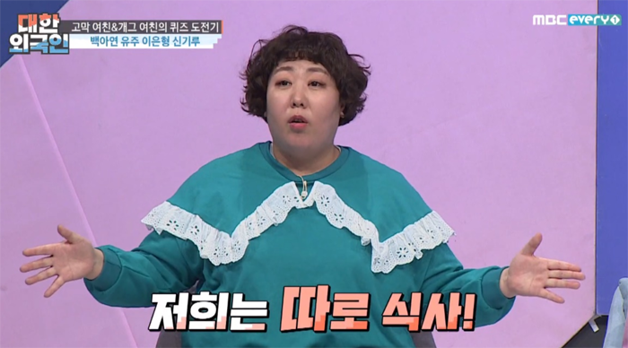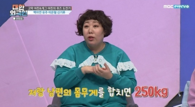 그 이유는 남편은 야채 위주를 좋아하고 아내인 신기루는 육류를 좋아한다고 하며 그녀는 남편에 대해 “남편은 뚱뚱한데 웰빙돼지”라고 설명했습니다.