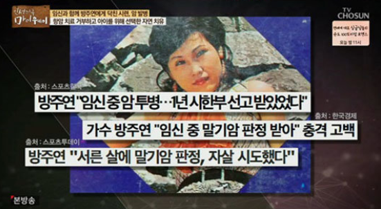 방주연은 임신 7개월 때 임파선암 3기 진단을 받아 1년 시한부 판정을 받았다고 털어놓았는데요. 그녀는 "몸이 아프기 시작하고 너무 고통스러웠다. 겨드랑이에 암이 생기더라“라며 “수술하면 어떻게 되냐고 물었더니 한 쪽 팔을 못 쓰게 되고 아이는 사산을 하라고 하더라. 유산이 아니라. 애가 배 안에서 다 형성이 된 상황이었다”며 “치료 포기 후에 출산을 했다”라고 설명했습니다.