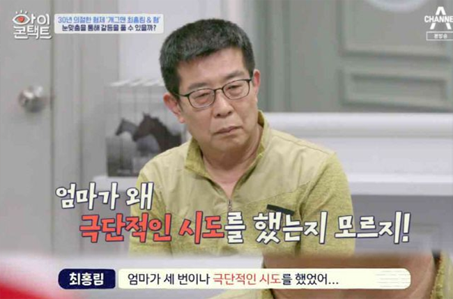이러한 괴롭힘으로 어머님이 3번이나 극단적 시도를 했고 초등학생인 최홍림이 병원에 어머님을 데려갔는데 택시 기사가 환자를 태우면 재수없다고 태워주지 않은 것이 지금까지도 큰 상처로 남았다고 합니다.