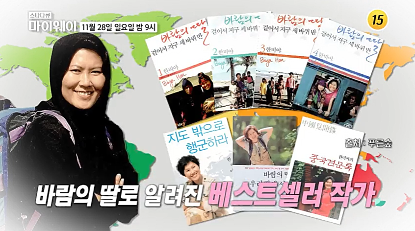 한비야는 35세가 되던 해, 국제홍보회사인 버슨-마스텔라 한국지사의 일을 그만두고 7년 간의 오지 여행에 올랐으며 이때의 경헝으로 ‘바람의 딸’, ‘걸어서 지구 세 바퀴 반’ 시리즈 4권을 내며 이름을 알리게 됩니다.