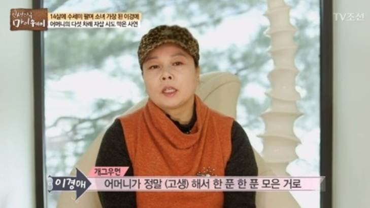 이후로 다섯 남매 중 셋째 딸인 이경애는 14살부터 수세미를 팔며 가족의 생계를 책임져야 했다고 하며 돈 되는 일은 뭐든지 다 했다고 합니다.