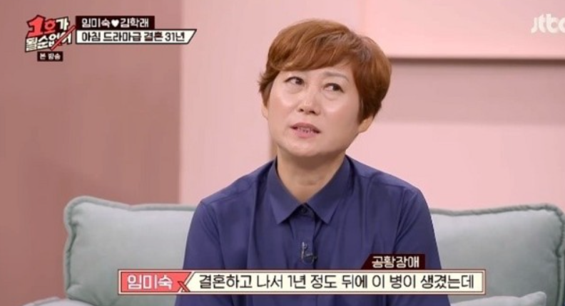 그녀는 “결혼 후 1년 정도 있다가 공황장애를 앍아 10년 동안 힘든 시간을 보냈다”라며 남편인 김학래는 일 때문에 바빠 집에서 볼 수가 없었다고 하며 “그 당시에 나는 혼자 있었다"며 외로움이 우울증과 공황장애를 심하게 만들었음을 털어놨습니다.