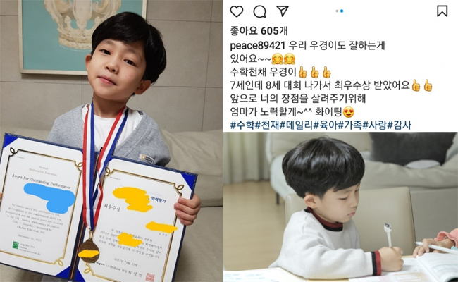 "우경이가 7살인데 8살 아이들과 수학경시대회 나가 최우수상을 받았다. 너도 살길이 있구나 생각이 든다"고 말했는데요. 최근 초등학교 1학년을 대상으로 한 수학경시대회에 나가 최우수상까지 탔다는 소식을 전하기도 했습니다.