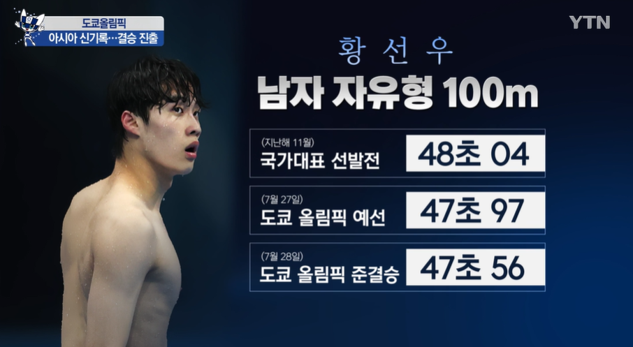 당시 올림픽으로 첫 국제대회 데뷔를 한 황선우는 메달 획득에는 실패했지만 고등학생 신분임에도 불구하고 자유형 100m 아시아 기록 및 세계 주니어기록(47초56), 자유형 200m 한국 기록 및 세계 주니어기록(1분 44초 62)을 새로 쓰며 큰 화제를 모았습니다.