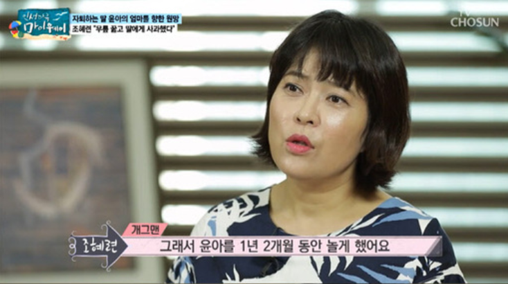 조혜련은 자신의 이혼이 자녀들에게 큰 심리적 충격이자 상처로 다가갔다고 고백하며 큰 딸 윤아 양은 중학교 3학년 때까지 전교 1등을 놓친 적이 없고, 명문고까지 진학했지만 두 달 만에 그만뒀다고. 이후 1년 동안 집에서 누워만 있었다고 설명했습니다.